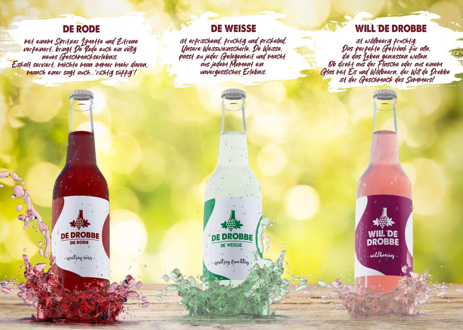 Lassen Sie sich von DE DROBBE verführen und entdecken Sie den Geschmack der Perfektion in jeder Flasche. Denn bei uns gilt das Motto: „Lass es ploppe un‘ genieß DE DROBBE“. Erleben Sie den Sommer mit einem Schluck DE DROBBE