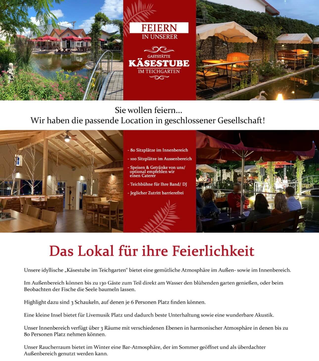 Die GaststĂ€tte ĂŒberzeugt nicht nur kulinarisch, sondern auch durch ihr Ambiente: gemĂŒtlich, einladend und familiĂ€r. Ob fĂŒr einen entspannten Abend, ein Treffen mit Freunden oder besondere AnlĂ€sse â die KĂ€sestube im Teichgarten ist ein Ort zum WohlfĂŒhlen und Verweilen.